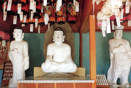 경상남도 유형문화재 제 122호 석조삼존불상은 돌로 만든 불상 3구가 함께 있는 것을 뜻한다. 교사리 석조삼존불상은 입상 2구와 좌상 1구로 구성되어 있다. 현재 위치에 파손된 상태로 흩어져 있던 것을 1942년에 유보성 화상(柳普城 和尙)이 암자를 짓고 이곳에 다시 모셔 두었다. 서방 극락정토의 아미타여래가 중앙에 본존불로 자리 잡고 있다. 그 왼쪽에는 손에 구슬을 든 지장보살이 있으며 오른쪽에는 머리에 관을 쓴 관음보살이 있다. 세 불상 모두 머리와 손, 발 등 훼손된 부분을 석고로 복원한 것으로, 원래의 모습을 정확히 알 수 없었다. 그러나 현재는 복원이 마무리되어 삼존 중 관음보살은 원래 모습을 되찾았다. 중앙에 있는 아미타여래는 왼쪽 어깨에만 옷을 걸친 채 가부좌를 틀었고, 양 손바닥은 무릎을 짚고 앉아 있다.