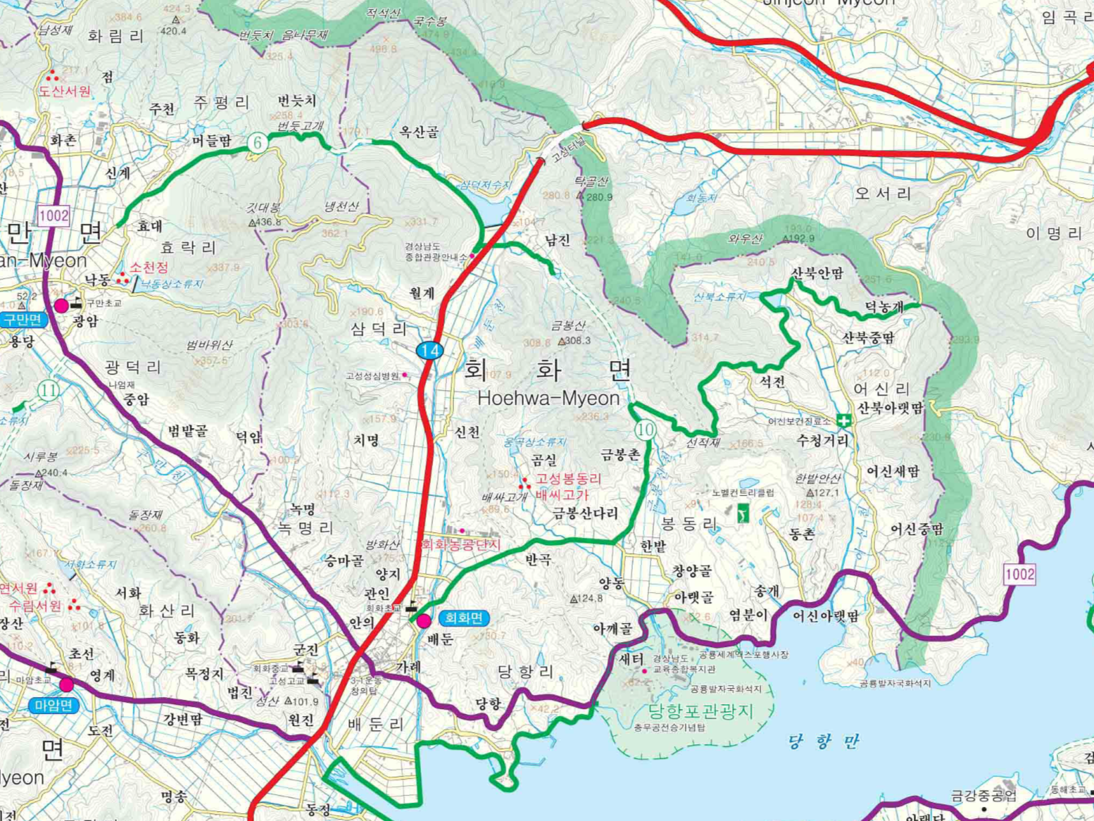 면내의 문화재 등 사적은 배둔리 성터와 봉동리 산사유적, 금봉산 고분군이 있고 당항리에 전국적으로 유명한 당항포관광지, 배둔리에 회화농공단지가 조성되어 각 기업체가 입주하여 가동 중에 있으며 국도14호선이 면 소재지를 통과하고 있어 교통의 요충지로 발전하고 있다.